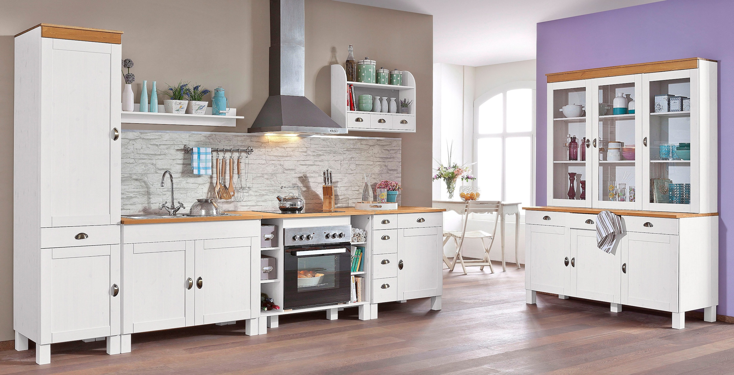 Home affaire kuchen set oslo 7 tlg ohne e gerate breite 350 cm aus massiver kiefer 23 mm starke arbeitsplatte mit metallgriffen landhaus kuche in 2 tiefen erhaltlich online kaufen otto.
